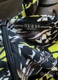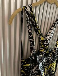 👗✅ Vendo splendida tutina estiva GUESS, taglia M, in viscosa, leggera e fresca, perfetta per l’estate. Fantasia tropicale nei toni del nero, bianco e giallo. Le spalline si incrociano sia sul davanti che sul retro, aggiungendo un tocco originale al design. Chiusura con zip sul retro per una vestibilità perfetta.