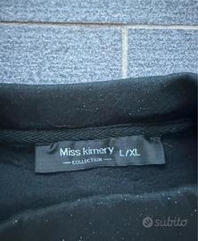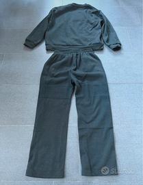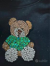 La tuta è felpata con brillantini il pantalone palazzo con tasche , la maglia con applicazione del teddy con pietre colorate.
