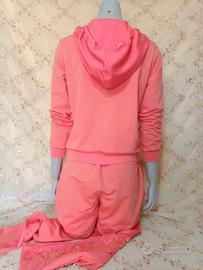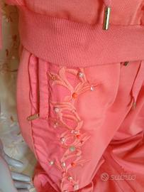 Il pantalone, con fascia elastica in vita, è regolabile con nastro, ha due tasche laterali con zip nascoste e la gamba destra arricchita da ricami e bijoux come la felpa, entrambe le gambe hanno una banda lucida, tono su tono