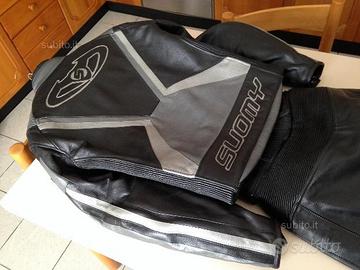 Tuta in pelle divisibile della Suomy, può ospitare un para schiena aggiuntivo oltre quello già integrato nella giacca, mai caduta, mai pista, solo uscite domenicali, sempre ingrassata per tenere la pelle morbida, saponette ancora sue originali e nuove. La tuta è divisibile ma può diventare intera con l'apposita cerniera che collega i pantaloni con la giacca. Giacca taglia 50. Pantaloni taglia 52.