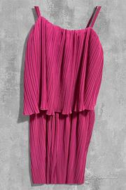 Tuta intera di marca (costava sui 200€, mai messa) da donna di colore fucsia/rosa caldo, con spalline sottili regolabili, corpetto a balze e pantaloni a gamba larga. Il design plissettato dona una vestibilità fluida, comoda ed elegante, valorizzando la figura senza costringere. Capo versatile, perfetto sia per occasioni casual diurne che per eventi serali, a seconda degli accessori abbinati.