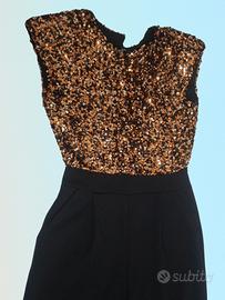 Vendo tuta elegante da donna, colore nero con top in paillettes oro. Modello raffinato e moderno, ideale per feste, cerimonie, eventi serali e occasioni speciali. Vestibilità comoda ed elegante, valorizza la figura.