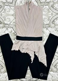 tuta tuta intera del brand Elisabetta Franchi composta da maglia top smanicato e drappeggiato color rosa cipria e pantaloni dritti color nero.