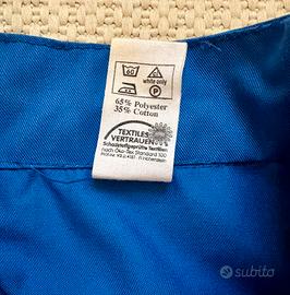 Bellissima tuta da lavoro intera originale FIAT, un pezzo vintage autentico perfetto per collezionisti, amanti dello stile workwear o per uso in officina. Il design è caratterizzato da un contrasto cromatico blu e bianco, con piping riflettente sulle maniche e sulle spalle. Presenta il logo FIAT ricamato sul petto. • Marca: Prodotta da Lauffenmühle (garanzia di qualità e resistenza nei tessuti da lavoro). • Dettagli: • Chiusura frontale coperta. • Polsini regolabili con velcro. • Tasche cargo laterali sui pantaloni. • Vita elasticizzata per un'ottima vestibilità. • Rinforzi decorativi a rombi sui gomiti. • Composizione: 65% Poliestere, 35% Cotone (Tessuto resistente e facile da lavare). • Certificazione: Öko-Tex Standard 100 (testato per sostanze nocive). • Condizioni: Ottime condizioni vintage, tessuto ancora molto robusto e colori vivaci.