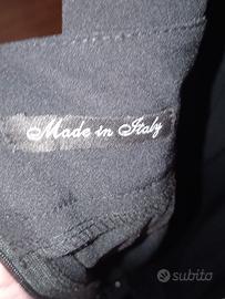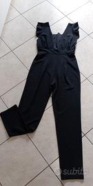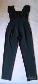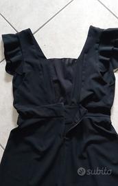 Tuta intera elegante nera. Con volant sulle maniche. Scollo dietro con chiusura a zip. Tessuto leggero e fresco. Ideale per le serate o occasioni speciali. Made in Italy. Lunghezza cm 138. Elastica