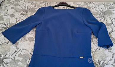 tuta elegante blu corallo, cucitura in vita, scollo sulla schiesna, allacciato nella parte alta con possibilità di fare fiocco. taglia s