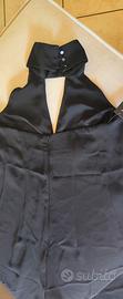 Tuta intera elegante in tessuto nero scivolato con pantaloni palazzo. Taglia L. Collo che si chiude con bottoncini.