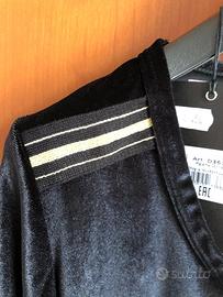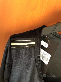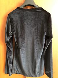 Maglia nera in finto scamosciato con piccole bande dorate sulle spalle.