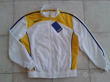 Vendo Tuta Macron Ghibli Tracksuit tg. s (torace cm 88-95 bacino cm 92 altezza cm159-171), tessuto 100% Poliestere Poly Fiber, interno collo in tessuto rovesciato e polsino in costina, tuta rappresentanza allenamento calcio sport runnign free time, color giallo-bianco blu bluette con zip intera e pantalone con fondo largo, nuova con cartellino ad euro 40,00.