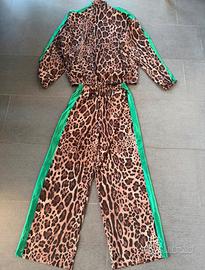 La tuta porta il pantalone a palazzo con bande verde,la giacca con zip.