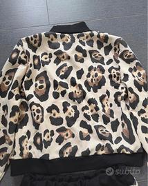 La tuta porta il pantalone a palazzo la felpa con zip tutta maculata,veste da una s fino a xl.