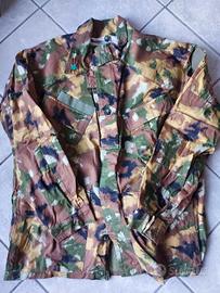 Completo mimetico colorazione Battaglione San Marco/lagunari. Giacca: spalle 55cm, manica 65cm, lunghezza 75cm. Pantalone: vita 50 cm, lunghezza 110 cm. No etichette. Tutto in perfette condizioni. Interno termico