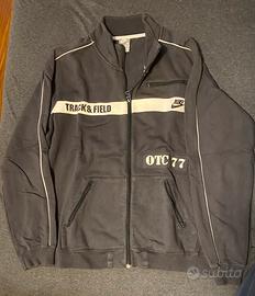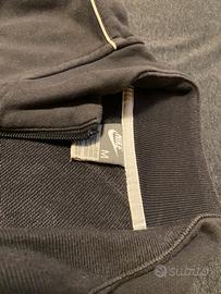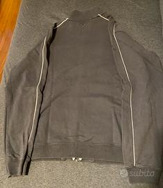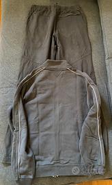 Tuta in cotone grigio scuro da uomo. Felpa di cotone garzato grigio scuro con fascia bianca sul davanti e riga bianca lungo le maniche, zip anteriore, 2 tasche anteriori con zip, 1 taschino anteriore in alto a sinistra con zip, taglia M.