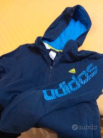vendo tuta originale ma usata Adidas X ragazzo età 13-14 anni colore blu, con colore azzurro in contrasto nel cappuccio e nella manica con scritta Adidas , tasche laterali, cerniera centrale. Pantaloni con tasche e culisse buone condizioni
