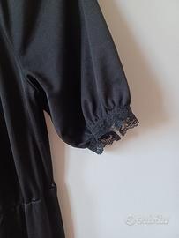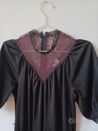 Tuta pantalone vintage, con inserto in pizzo sullo scollo a V e rifiniture sulle maniche. Il contrasto tra il nero e il pizzo bordeaux richiama uno stile anni ’80 / ’90, perfetta se indossata con stivaletti o con il tacco. • Manica corta • Gamba morbida con elastico • Chiusura posteriore con zip Tessuto leggermente usurato in alcune parti non immediatamente visibili (vedi foto dettagli); nessun difetto evidente.