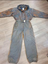 Spendida tuta sci by Colmar in tessuto cangiante verde blu e oro con collo di pelliccia blu ,tg.48/50,