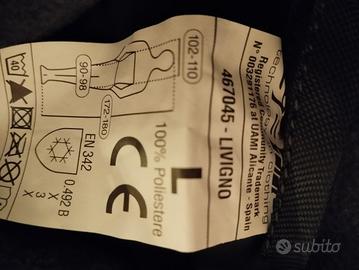 Taglia L. Tuta che mantiene la temperatura corporea fino a -17 in assenza di attività fisica e fino a -40 in caso di modesta attività fisica. Presenti cappuccio felpato all'interno, quattro tasconi e tasca per cellulare. Alcune dimensioni sono riportate sull'etichetta. NUOVA con cartellino.