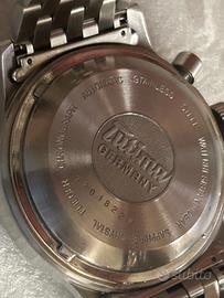 Tutima modello Flieger Chronograph F2 modello 780, movimento automatico con calendario giorno e data. Cassa in acciaio inossidabile satinato con lunetta girevole bidirezionale , corona a vite, vetro Cristallo zaffiro , quadrante nero con lancette e numeri arabi luminosi Super-Luminova senza radiazioni . Bracciale in acciaio inossidabile con maglia a chicchi di riso, chiusura a farfalla, resistenza all'acqua 10 atm, cassa diametro 38,50 senza corona, spessore mm. 15,00 mm. Condizioni perfette, senza alcun graffio, come nuovo completo di tutto il corredo, revisionato a gennaio 2026