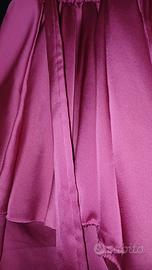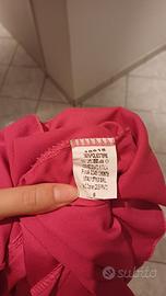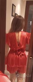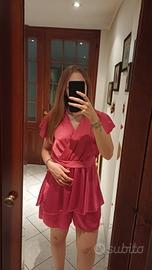 Tuta corta in tessuto leggero color fucsia, con gonna pantalone e vita elasticizzata.