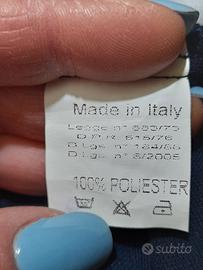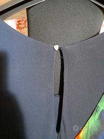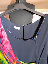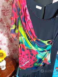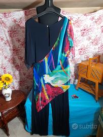 Tutone elegante per cerimonia a girocollo tutto blu elasticizzato con pietre di varie colori nella parte del collo e la vela turara fi multicolore sia davanti che dietro che copre tutte le forme drappeggiato da pietre di multicolore ,mezza manica velate una blu e una multicolore indossato solo una volta per un matrimonio taglia 52 l'etichetta e stata tolta per fastidio. Misure lunghezza 155 cm spalle 40 cm ascella ad ascella 52 cm vita 53 elasticizzato , per info e altre foto scrivetemi