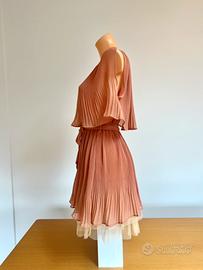 Abito corto di Twin Set in leggero tessuto plissettato color rosa cipria, con sottogonna in tulle beige chiaro. Modello con scollo morbido, maniche ad aletta e cintura coordinata in vita regolabile e rimovibile. Taglia S. In ottime condizioni. Segnalo (vedi ultima foto) un passante della cintura allentato.