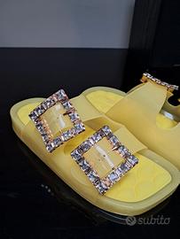 Ciabattina nuova marca Twinset ( con cartellino e confezione con logo) di morbida plastica di colore giallo e applicazioni dorate in metallo e strass. Calzano una TG.36/37.