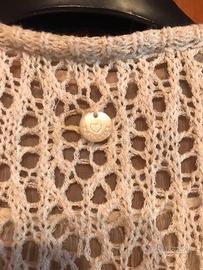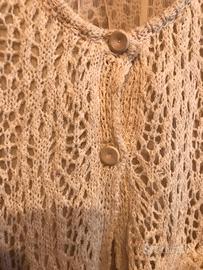 Cardigan corto traforato donna ,taglia M color panna con all’interno un inserto trasparente in tinta . Marchio Twinset Simona Barbieri . Aperto davanti con 2 bottoni e un piccolo taschino laterale .Scollo arrotondato .Indossato poche volte ,non presenta strappi ne’ difetti .