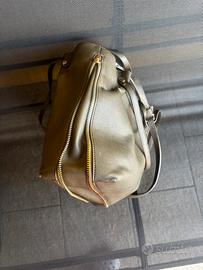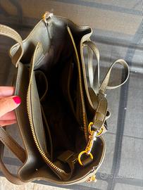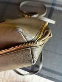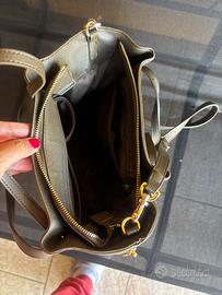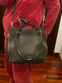 Borsa tote con doppia portabilità a mano e tracolla. Decorata dal logo lettering metallizzato frontale e da cerniere zip con charm laterali. Composta da un unico scomparto con interno foderato. Chiusura tramite cerniera zip. Manici fissi. Tracolla con catenella e spallaccio removibile. Composizione: Ecopelle. Altezza 29 cm, Larghezza 35 cm, Profondità 12 cm. La borsa è usata e si vede l’usura nei quattro angoli inferiori ma è molto capiente e comoda e fa sempre una bella figura.