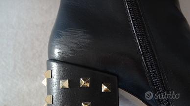 Stivaletti, tronchetti, stivali alla caviglia, ankle boots della Twin set di Milano. In morbida pelle nera, con borchie oro sul tacco, chiusura con cerniera (presente da ambo i lati). Ulteriori foto su richiesta