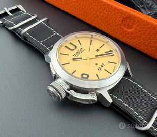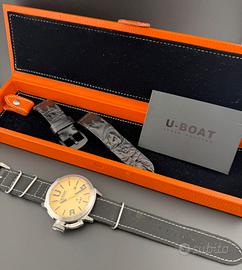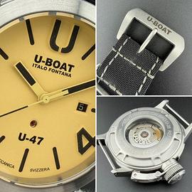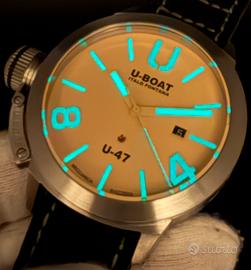 Spettacolare U-Boat Classico U-47 ref. 8106, cassa da 47mm, cristallo zaffiro, automatico cal. U-28 (base ETA 2824-2), fondello a vista, sub 100m, cinturino nato in pelle/tessuto + secondo cinturino in pelle originali, corredo completo, condizioni splendide.