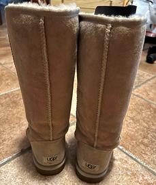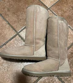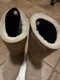 Stivali in montone rovesciato e pelle scamosciata, color beige -cammello, modello mezza gamba altezza 35 cm. suola in gomma incisa e tacco, cm. 2, usati pochissimo, pelo interno fluido. TG 39-40. Escluso Perditempo.