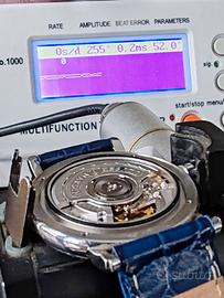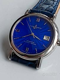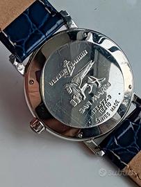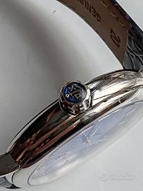 ULYSSE NARDIN SAN MARCO - REF. 133-72-9 - QUADRANTE SMALTO BLU DATI TECNICI CERTIFICATI: MARCA: Ulysse Nardin MODELLO: San Marco Classico COLLEZIONE: San Marco REFERENZA: 133-72-9 SERIALE: 15410 ANNO PRODUZIONE: 1997-1999 circa PROVENIENZA: Swiss Made CASSA: Materiale: Acciaio inossidabile 316L Diametro: 37mm esclusa corona Spessore: 9.5mm Lunetta: Zigrinata "coin edge" in acciaio Fondello: Acciaio a pressione con 6 viti, Leone di San Marco alato in rilievo Corona: A vite con logo ancora Ulysse Nardin su smalto blu Vetro: Zaffiro sintetico antiriflesso bombato Impermeabilità: 30 metri / 3 ATM Anse: 20mm QUADRANTE: Tipologia: Smalto Grand Feu blu cotto a 800°C Decorazione: Guilloché a onde concentriche eseguito a mano Indici: Numeri romani applicati XII-VI-IX, indici a bastone applicati Lancette: Dauphine in acciaio lucido Data: Finestra a ore 3 con sfondo bianco Scritte: "Ulysse Nardin", "Chronometer Officially Certified", "T-SWISS MADE-T" Particolarità: Tritio originale anni 90, ora senza luminescenza per normativa MOVIMENTO: Calibro: UN-13 Manufacture Ulysse Nardin Base: ETA 2892-A2 modificata e rifinita da Ulysse Nardin Certificazione: COSC - Contrôle Officiel Suisse des Chronomètres Tipologia: Automatico con rotore di carica bidirezionale Rubini: 21 jewels Frequenza: 28.800 alternanze/ora - 4 Hz Riserva di carica: 42 ore Funzioni: Ore, minuti, secondi centrali, data a scatto rapido Precisione: -4/+6 secondi al giorno secondo norme COSC Decorazione: Rotore firmato "Ulysse Nardin" con ancora, ponti decorati a perlage e côtes de Genève Scritta sul ponte: "TWENTY-ONE 21 JEWELS UNADJUSTED" PRESTAZIONI TESTATE A CRONOCOMPARATORE - VEDI FOTO: