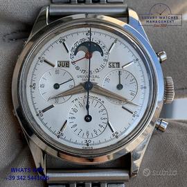 Universal Genève cronografo Tri-Compax calendario completo con fasi lunari acciaio, anno di produzione 1958 circa, vetro plastica bombato, quadrante impeccabile colore argento a tre contatori orizzontali con fasi lunari indici e sfere al radio luminescente originale Universal Genève dell’epoca mai ritoccato o ristampato, movimento meccanico a carica manuale, bracciale acciaio con chiusura deployante originale Universal Genève dell’epoca.