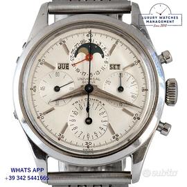 Orologio originale Universal Genève in ogni particolare, molto raro, revisionato in ottime condizioni, segni di usura assenti o appena visibili, scatola originale Universal Genève dell’epoca, garanzia/dichiarazione di vendita nostro negozio valida 12 mesi.
