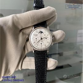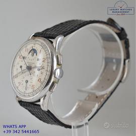 Universal Genève cronografo Tri-Compax calendario completo con fasi lunari in acciaio, anno di produzione 1950 circa, vetro plastica bombato, quadrante colore avorio a tre contatori orizzontali indici arabi applicati con calendario completo e fasi lunari, movimento meccanico a carica manuale, cinturino generico di lucertola colore nero con fibbia in acciaio originale Universal Genève.
