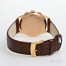Clover Gioielli pone in vendita Universal Geneve Unicompax Cassa di diametro 37 mm realizzato in oro rosa 18Kt, quadrante Silver, ghiera liscia in oro rosa, contatori del chrono ad ore 3 e 9, Cinturino aftermarket in pelle marrone con fibbia aftermarket in acciaio dorata, Vetro plexiglass, movimento a carica manuale Universal Geneve Cal. 285. Orologio in condizioni buone revisionato a Gennaio 2025. (il quadrante ha segni di ossido)