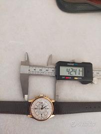 No perditempo per cortesia. Cronografo Universal Geneve degli anni 1950/1960 revisionato da poco, perfettamente funzionante con cassa in oro 18 carati del peso di 16 grammi. L'orologio monta un calibro 285 di Universal Genève trattasi di un movimento cronografico a carica manuale con smistamento a ruota a colonne, considerato uno dei pilastri dell'orologeria vintage della metà del XX secolo. Introdotto negli anni '30 e ampiamente utilizzato fino agli anni '50, è celebre per la sua precisione e la raffinatezza meccanica.