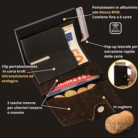 🩳 [COMPATTO] (10 x 7 x 2,5 cm) – il porta carte di credito schermato contiene fino a 6 carte. Un meccanismo impedisce la caduta anche se capovolto e consente una facile estrazione delle tessere. Porta carte credito uomo facilmente maneggevole. Con 2 ulteriori tasche interne portacarte. Il portafoglio uomo piccolo è comodo da tenere nella tasca davanti dei pantaloni ed evita il mal di schiena che insorge nel tenere il portafoglio nella tasca posteriore. 🌎 [ECOLOGICO] – Il porta carte di credito e fermasoldi è realizzato in morbido sughero portoghese, alluminio e clip portabanconote in carta kraft. Abbiamo scelto la carta kraft perché è molto più RESISTENTE, duratura ed ecologica della plastica, non si rompe e non si deteriora con l’uso prolungato. Il sughero è soffice al tatto, impermeabile e resistente. Senza pelle animale e senza pelle sintetica è anche un portafoglio donna piccolo vegan che si adatta a tutte le tasche ed è invisibile. 💳 [BLOCCO RFID] – porta carte di credito anti-frode e dotato di protezione RFID che impedisce il furto dei dati personali. Il porta tessere mette al sicuro da contraffazione e clonazione le carte inserite. E’ uno smart wallet moderno, perfetto come regalo uomo e regalo donna. ♂♀ [UNISEX] – Il portafoglio slim è Unisex ed è indicato sia come portafoglio donna che portafoglio uomo. E’ elegante, raffinato e minimale e può essere portato nella borsa o nella tasca dei pantaloni.