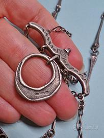Importante collana vero vintage anni ’70 dello storico marchio di gioielli Uno A Erre, realizzata in argento 800 con una lunga catena caschinpetto lavorata e ciondolo / pendente. Lo stile è quello modernista / brutalista di cui marchi come Unoaerre e Ottaviani sono stati i massimi esponenti italiani, con forme ispirate alla biologia e all’arte etnica, che riescono a sembrare al tempo stesso primitive ed estremamente moderne. La collana è particolarmente versatile in quanto può essere portata lunga o avvolgendola in due giri attorno al collo, ed è inoltre possibile sganciare il pendente. Marchiato in più punti 800 e 1AR. Lunghezza catena 95cm !!!!!!!!!!!!NON VENDO A PESO!!!!!!!!!!! Le richieste di pesare l'oggetto verrano ignorate NO CONSEGNA A MANO, SOLO SPEDIZIONE