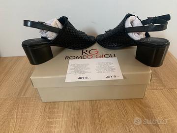 Usati una sola volta, sandali con tacco di 6 Cm, marca Romeo Gigli, di colore nero, con chiusura con laccetto, in vera pelle con tanto di certificazione ( vedi foto), con la sua scatola originale.