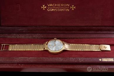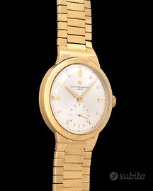 Vacheron Constantin Geneve. Scatola originale dell'epoca. Estratto d'archivio della casa madre. Chronometre Royal Ref. 6075. Museum Conditions. 18 Kt. Yellow Gold. N/S 356XXX. Anni 50'. 35 mm. Cassa in oro giallo 18 kt con fondello a pressione. Quadrante argentato soleil con grafica indelebile, indici applicati e secondi al 6. Movimento meccanico manuale cal. P1007/BS numero 507806. Bracciale in oro giallo 18 KT. Lunghezza bracciale in oro, con maglie lavorate, di circa 19.5 cm. Noto per precisione e affidabilità. Tutte le parti sono firmate (quadrante, cassa, movimento e bracciale). Orologio di grande eleganza e collezionabilità.