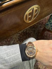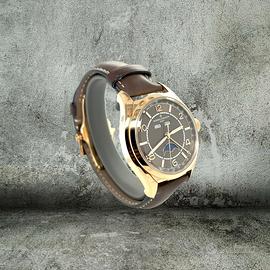 L’ultimo calendario completo prodotto da Vacheron Constantin, sapiente connubio di stili ed epoche differenti, questo orologio in oro rosa presenta tutte le indicazioni del calendario: lancetta della data, finestrella della data e del mese e indicatore di precisione delle fasi lunari, con regolazione necessaria una sola volta ogni 122 anni. Enfatizzata dal cielo blu che le fa da sfondo, la rappresentazione della luna in oro rosa si abbina perfettamente al quadrante seppia. Un’eleganza che taglia il fiato. Listino attuale: 49500 euro.