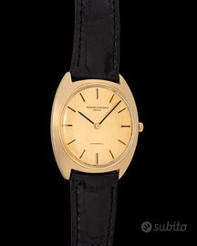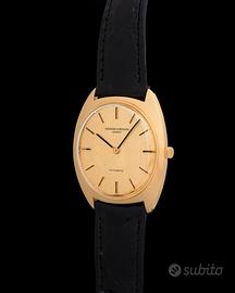 Vacheron Constantin Ref. 7595 Jumbo. Ultra Thin - Large Size - Yellow Gold 18Kt. n/s 6197XX. Elegante e raffinato Vacheron & Constantin ref. 7595 in oro giallo 18 carati, un classico dress watch della maison ginevrina risalente agli anni ’60/’70. La cassa dalle linee morbide presenta proporzioni armoniose e uno stile senza tempo. Il quadrante color champagne/oro, con indici applicati a bastone e lancette sottili, è impreziosito da una piacevole patina naturale che ne testimonia l’autenticità e il fascino vintage. Firma “Vacheron & Constantin Genève” e dicitura “Automatic” al 6. Movimento automatico di manifattura Vacheron Constantin, sinonimo di alta orologeria svizzera e finiture di pregio. Orologio elegante, perfetto come dress watch o come pezzo da collezione per appassionati del marchio.