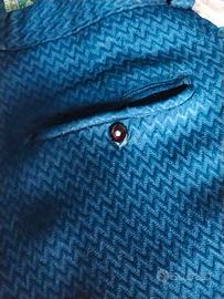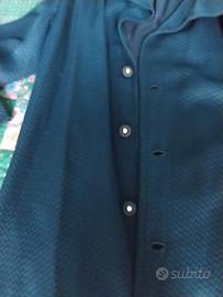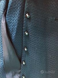 Abito completo di Valentino, gilet pantaloni e cappotto lungo da colletto a piedi di 145 cm, colore blù e bottoni neri con pietre bianche, vendibile separatamente da accordare