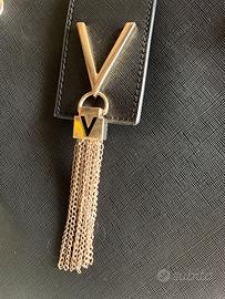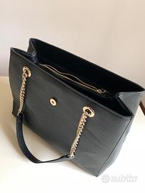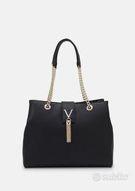 Elegante e sofisticata, questa borsa Valentino è il perfetto accessorio per aggiungere un tocco di classe al tuo look quotidiano. Realizzata in un raffinato nero con dettagli dorati, presenta un design moderno impreziosito dal logo "V" con ciondolo a catena. Le dimensioni generose (Altezza: 30 cm, Lunghezza: 36 cm, Ampiezza: 14 cm, Manico: 27cm) la rendono ideale per contenere tutto il necessario, mentre il manico di 27 cm con catene dorate garantisce comfort e stile. Perfetta per occasioni formali o casual, questa borsa è un must-have per chi cerca eleganza e praticità in un unico accessorio.