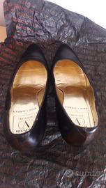 Décolleté in pelle nera e inserto laterale in camoscio, VALENTINO GARAVANI COUTURE by René Caovilla, misura 36, tacco 7 cm., "V" dorata sul lato del tacco.