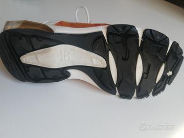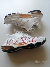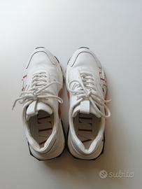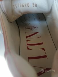 Valentino Garavani Sneakers Bounce pelle bianca n. 38, con scritta rossa LOVE laterale e scritta rossa "In your eyes I can see an eternity" sul tallone. Presentano segni neri sulle suole laterali come da foto. In perfette condizioni per il resto, anche internamente, in quanto indossate poche volte.