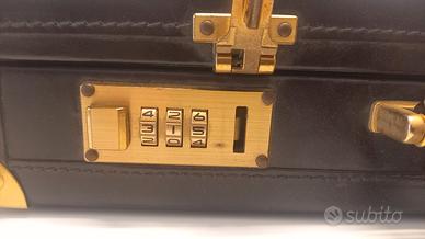 classica valigetta ventiquattrore rigida in pelle marrone scuro con finiture e serrature a combinazione in metallo dorato.