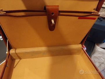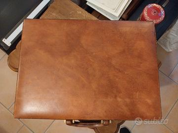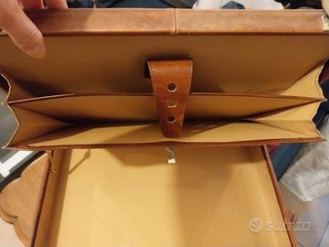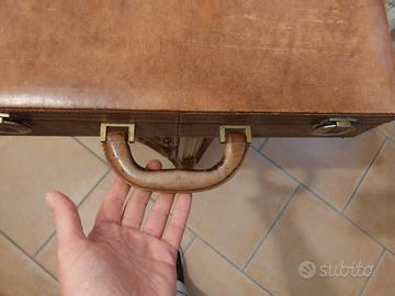Valigetta 24 ore squadrata,in pelle marrone cuoio. Con manico e doppia apertura a scatto,i pannelli sono leggermente rovinati dal tempo.All'interno tasconi rigidi portadocumenti.Da mettere a posto la molla laterale interna in metallo, che tiene aperta la valigetta. Anni '70. Tenuta in modo perfetto ed eccellente.Pulitissima e senza odori.Tutta integra a parte leggeri segni sulla pelle che non ne precludono l'utilizzo e anzi ne ravvivano l'autenticità,come si vede dalle foto.Quattro piedini d'appoggio sotto. Misure:42 cm lunghezza 8,5 cm larghezza 31 cm altezza.