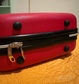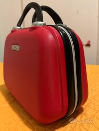 Pratica e compatta valigetta da viaggio, colore rosso acceso con manico nero.